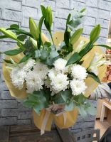 В составе лилии с хризантемами. Возможны замены по сортам в связи с сезонностью, цветовая гамма и стилистика букета остаются прежними