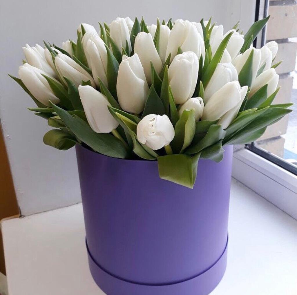 35 белых тюльпанов в шляпной коробке Доступен к предзаказу после 2 марта Внутри находится аквапак с водой, при получении необходимо убрать пакет, подрезать тюльпаны и поставить в вазу с снеговой водой Коробочка останется для хранения личных вещей Краснодарский тюльпан