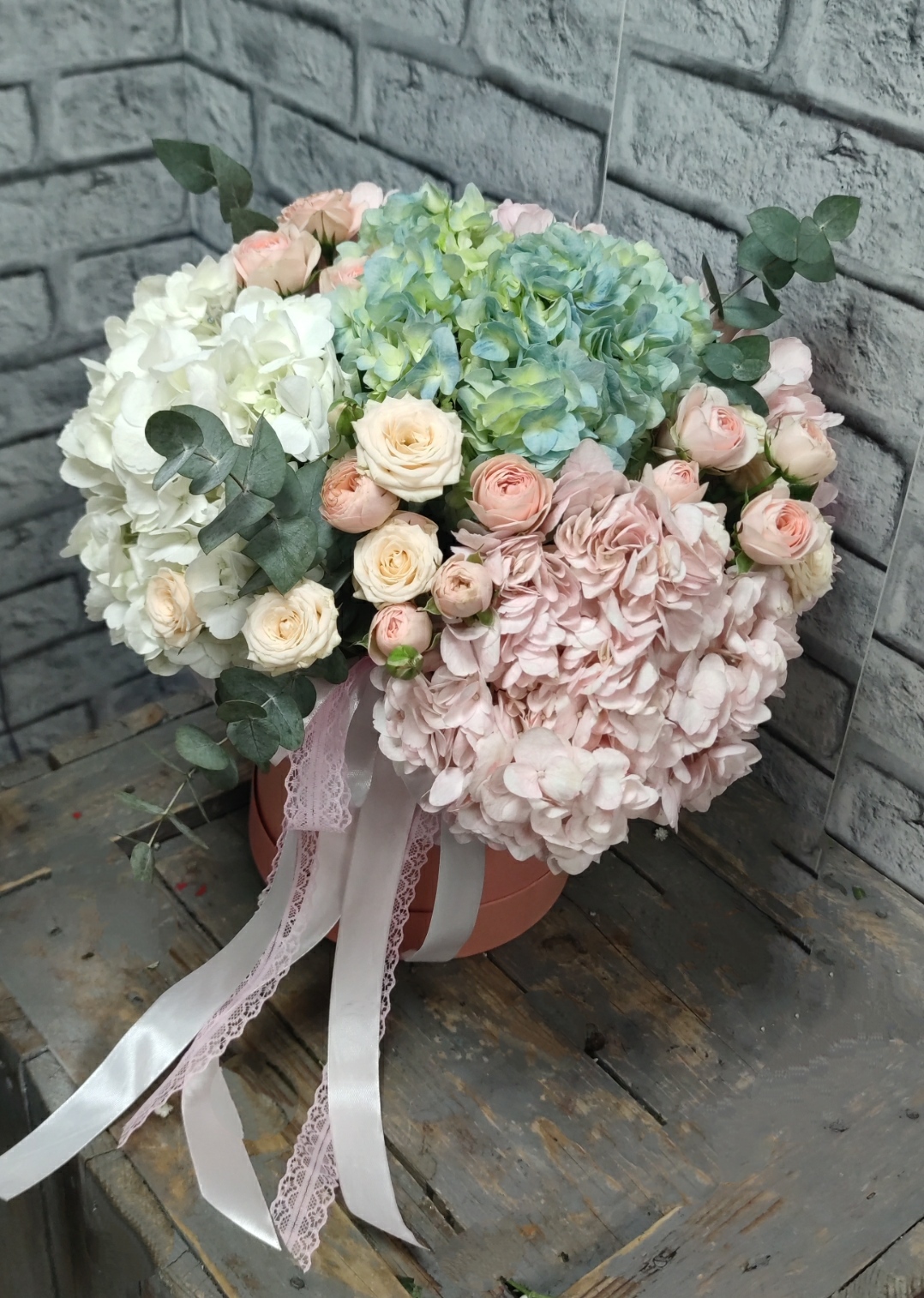 Композиция с гортензией и кустовой розой По сортам возможны замены, цветовая гамма и стилистика букета остаются прежними Данный товар доступен только к предзаказу ко Дню Мамочек - 30 ноября