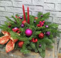 Размер 70см * 35 см Композиция составлена на металлической подносе, внутри находится флористическая губка-оазис, напитанная водой