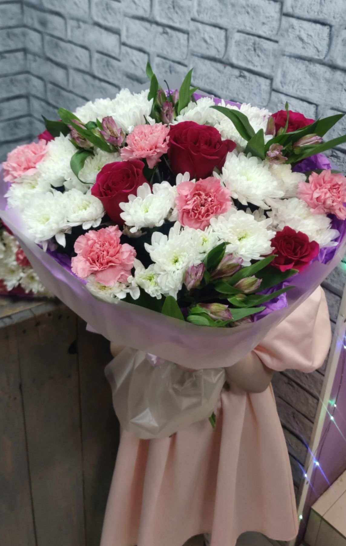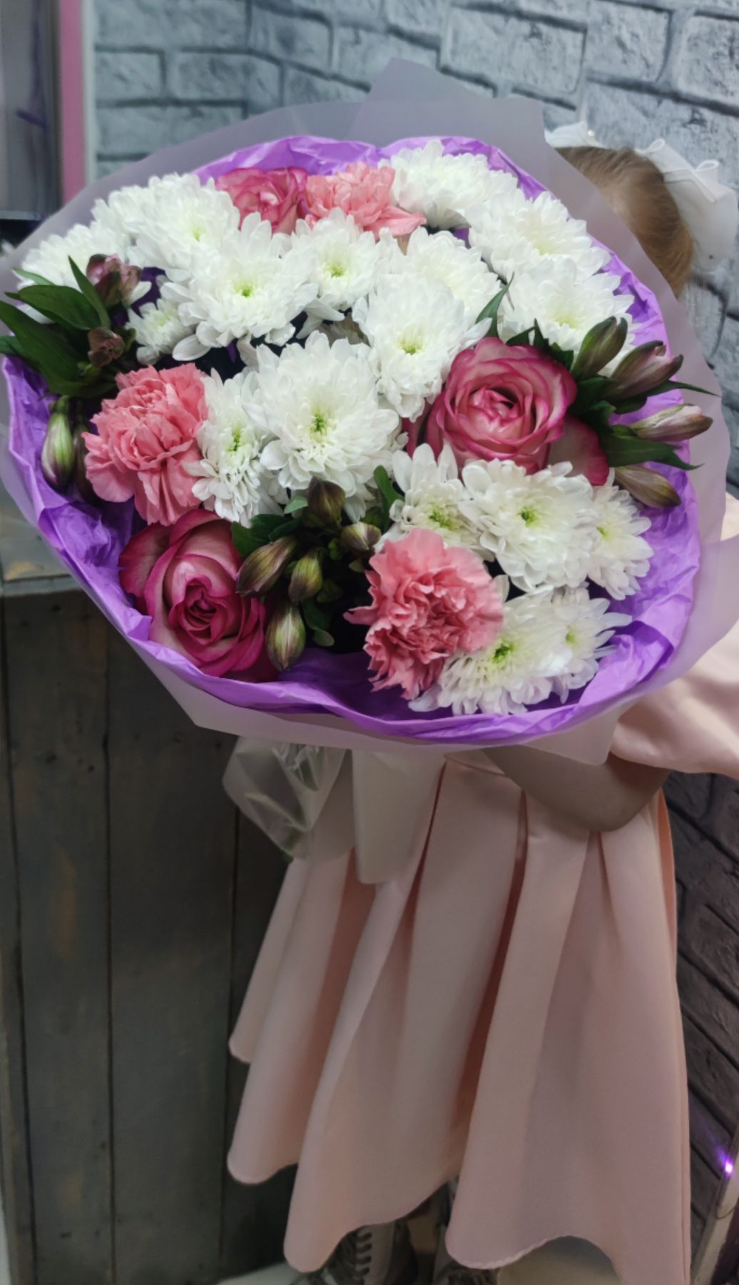 Нежное облачко из кустовая хризантем, роз, альстромерии и диантусов. По сортам возможны замены в связи с сезонностью, цветовая гамма и стилистика букета остаются прежними Доступен только к предзаказу ко Дню Мамочек - 30 ноября