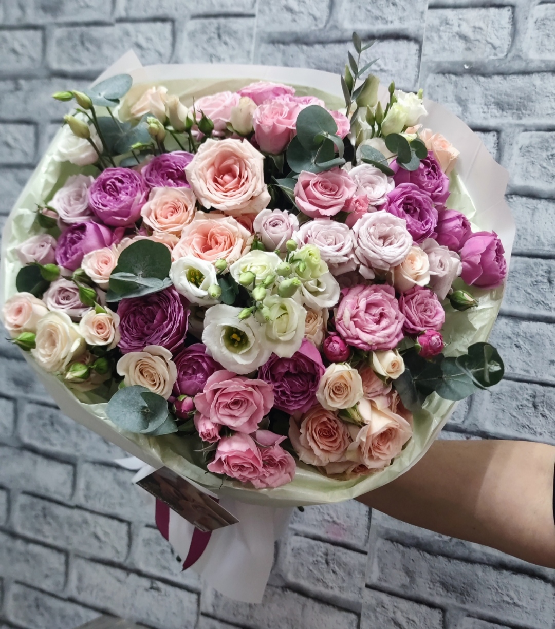 Микс нежных оттенков кустовых роз (18 веточек) с эутомой (3 веточки). Сорта роз могут быть заменены в связи с наличием, цветовая гамма и стилистика букета остаются прежними
