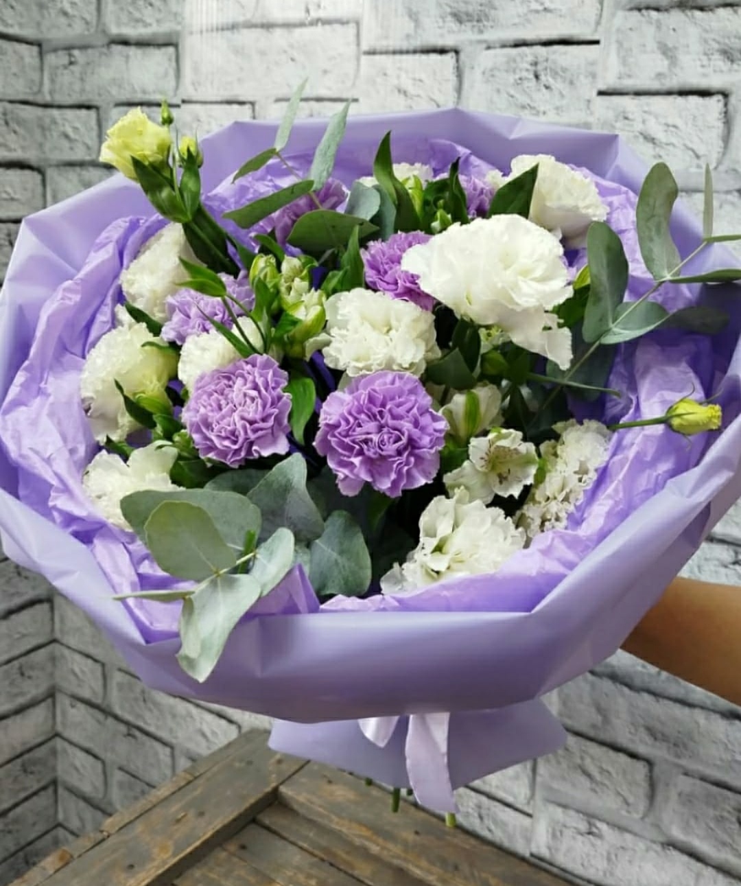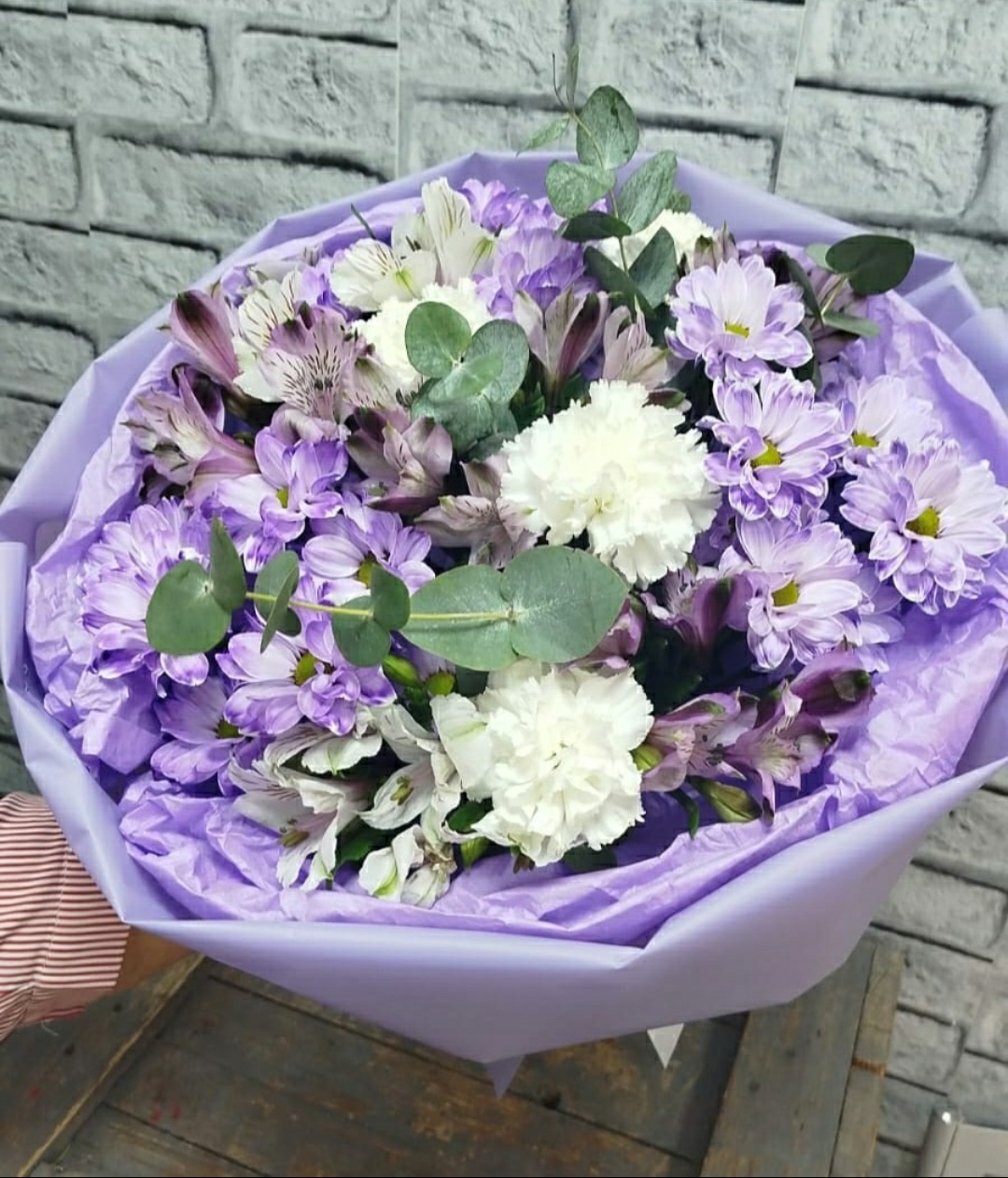 Сборный букет с диантусами, кустовыми хризантемами, альстромерией, эустомой . По сортам возможны замены в связи с сезонностью, цветовая гамма и стилистика букета остаются прежними