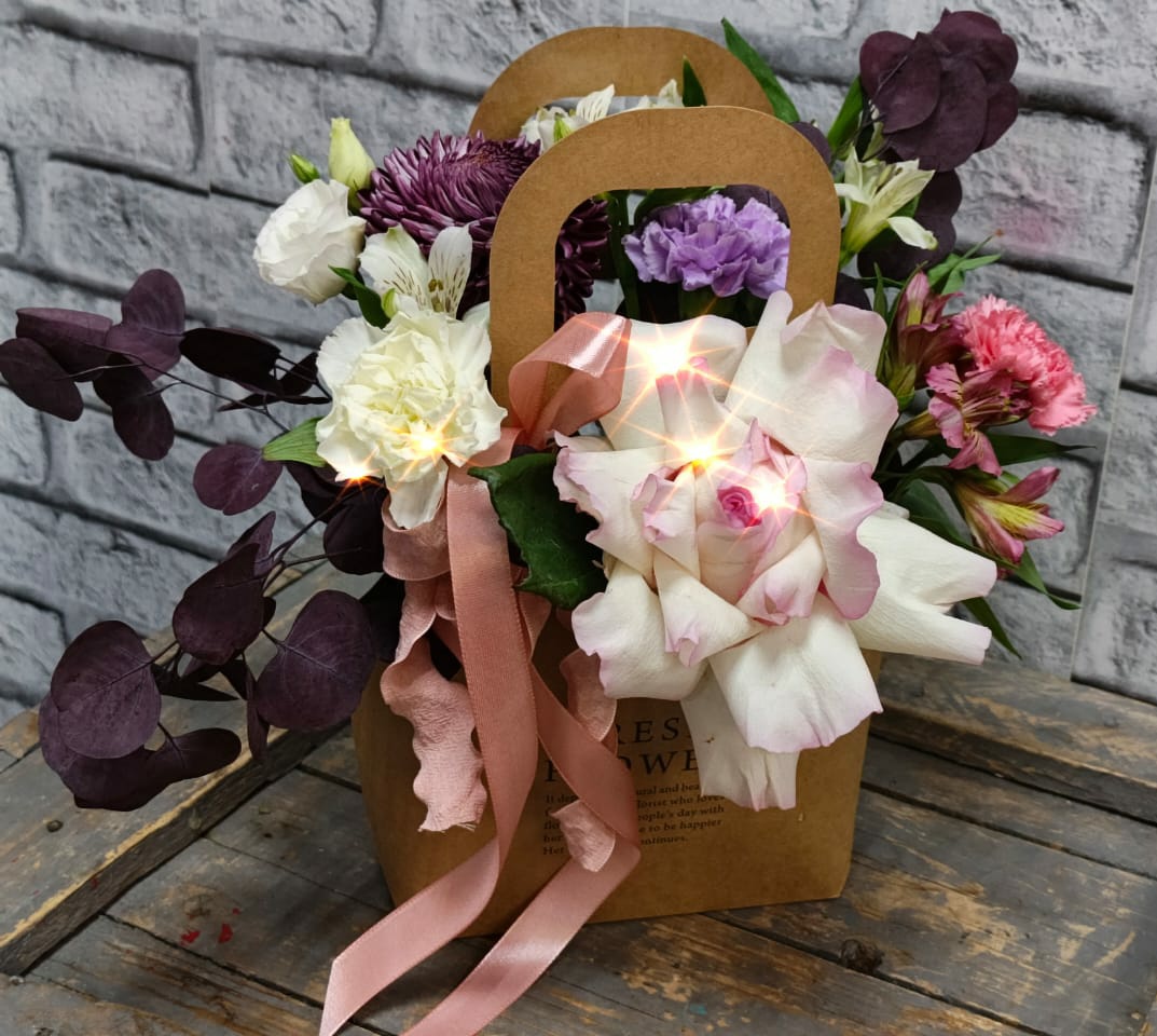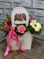 Внутри находится флористическая губка-оазис, напитанная водой В составе диантусы, альстромерии, гербера или французская роза, эустомы, диантусы