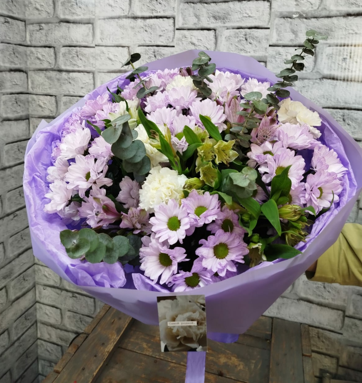 Сборный букет с хризантемами, альстромерией, диантусами, зеленью. По сортам возможны замены в связи с сезонностью, цветовая гамма и стилистика букета остаются прежними Доступен только к предзаказу ко Дню Мамочек - 30 ноября