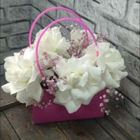 В составе 5 французских роз. Внутри находится флористическая губка-оазис напитанная водой
