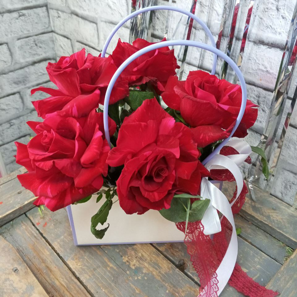 В составе 5 французских роз. Внутри находится флористическая губка-оазис напитанная водой