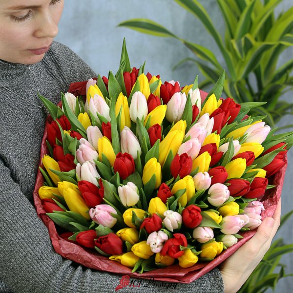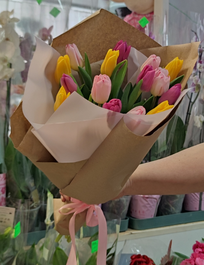 Доступен к предзаказу после 2 марта Краснодарские Тюльпаны в упаковке В букете микс разных оттенков