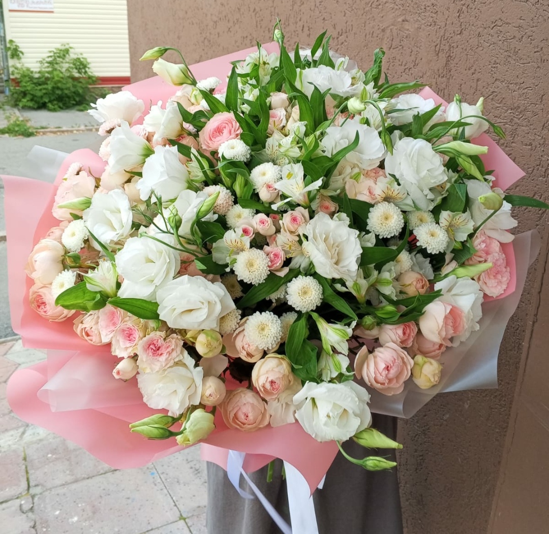 Сборный букет с эустомой, кустовой розой, хризантемой, альстромерией По сортам возможны замены в связи с сезонностью, цветовая гамма и стилистика букета остаются прежними Доступен только к предзаказу ко Дню Мамочек - 30 ноября