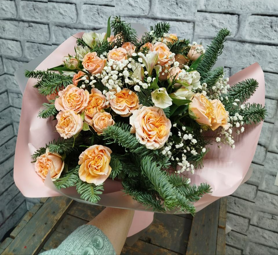 В составе кустовые розы, альстромерии, нобилис - голубая ель, искусственная веточка. По составу могут быть замены, в связи с с наличием, цветовую гамму и стиль букета сохраняем.